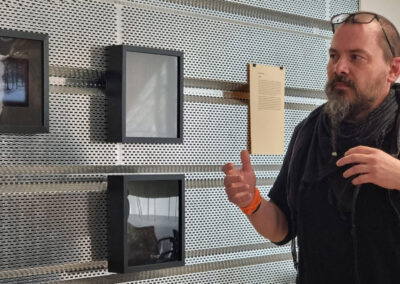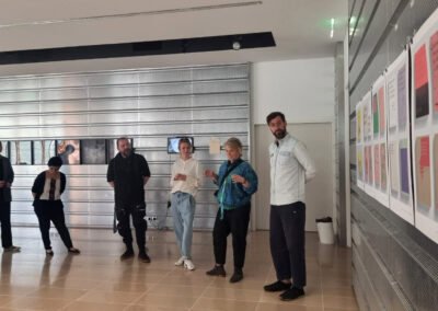 Podczas pobytu w uB, dr hab. Magdalena Hlawacz, dr hab. Bartosz Posacki i dr Paulina Ptaszyńska przeprowadzili warsztaty dla studentów kierunku studiów magisterskich Intercultural Management, a także zaprezentowali wystawę swoich prac zatytułowaną “Mis/per/re/ception”, poświęconą tematyce migracji. Wystawa była przyczynkiem do działań warsztatowych ze studentami, którzy konfrontowali swoje naukowe podejście do społecznych i kulturowych konsekwencji mobilności z interpretacjami artystycznymi. Magdalena Hlawacz przedstawiła prace z zakresu projektowania graficznego – serię projektów okładki książki na temat narracji migrantów, którą pracownicy Labu zredagowali na podstawie kursu Akademii Cyfrowej FORTHEM (książka w druku: Carmona Rodriguez, C., Pujante, D. 2024, “Narrativas Migrantes”, Es Tirant, Madrid). Bartosz Posacki zaprezentował poruszającą serię grafik zatytułowaną “Schron” – krytyczny i emocjonalny komentarz do smutnej codzienności nieregularnej migracji. Paulina Ptaszyńska przygotowała prace poświęcone wizualizacji i kulturowej rekonstrukcji wielkich katastrof klimatycznych, które wywołały dyskusję na temat społecznych i fizycznych uwarunkowań migracji w antropocenie.