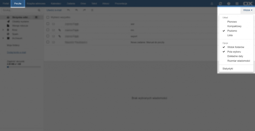Aby dostosować wygląd interfejsu do swoich preferencji należy wybrać jeden z dostępnych układów w menu [Widok] znajdującym się w prawym górnym rogu. Można wybrać tu układ strony, a także dostosować opcje wyświetlania wiadomości. Okno [Statystyki] pozwala przejrzeć analizę aktywności na koncie pocztowym.