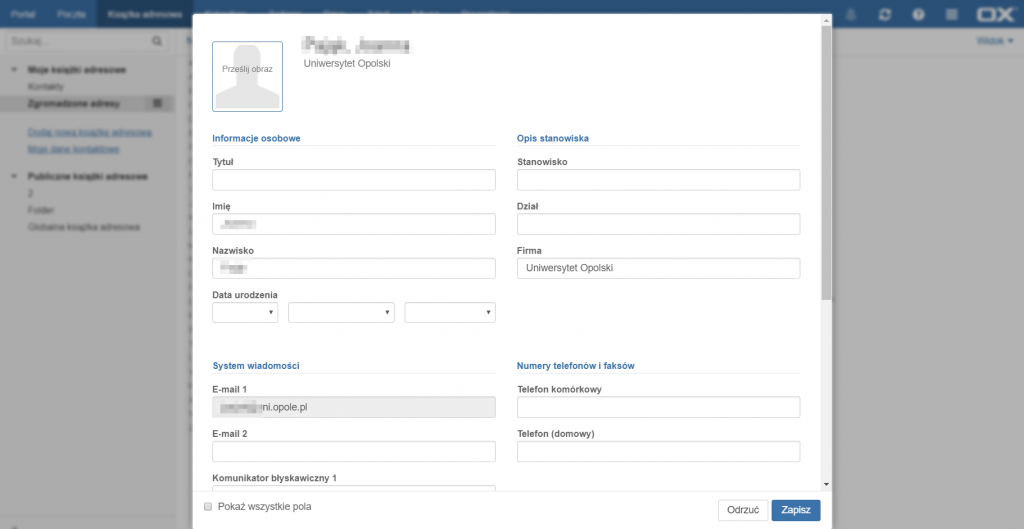 Następnie należy uzupełnić lub edytować wybrane pola po czym zatwierdzić zmiany przyciskiem [Zapisz] lub anulować operację przyciskiem [Odrzuć].