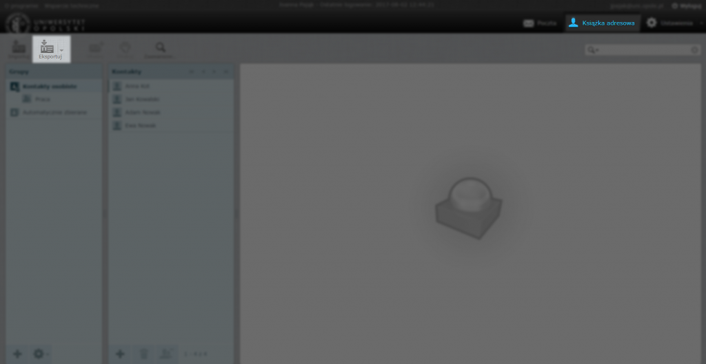 Aby przenieść kontakty ze starej książki adresowej należy najpierw eksportować je do pliku. Aby to zrobić należy otworzyć poprzednią skrzynkę pocztową, przejść do zakładki [Książka adresowa], wybrać daną grupę kontaktów, która ma zostać przeniesiona, a następnie kliknąć na przycisk [Eksportuj] znajdujący się na górze. Następnie można zmienić nazwę pliku .vcf zawierającego przenoszone kontakty lub zostawić domyślną nazwę [contacts]. Plik należy zapisać w miejscu łatwym do późniejszego znalezienia.