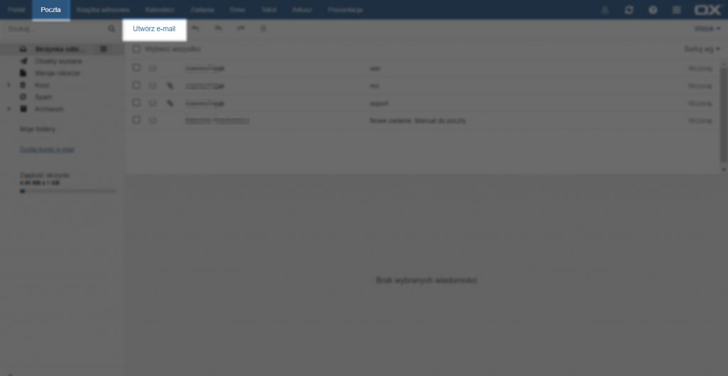 Aby utworzyć nową wiadomość należy wejść w zakładkę [Poczta] na górnym pasku menu. Następnie po kliknięciu [Utwórz e-mail] otwiera się okno tworzenia nowej wiadomości.