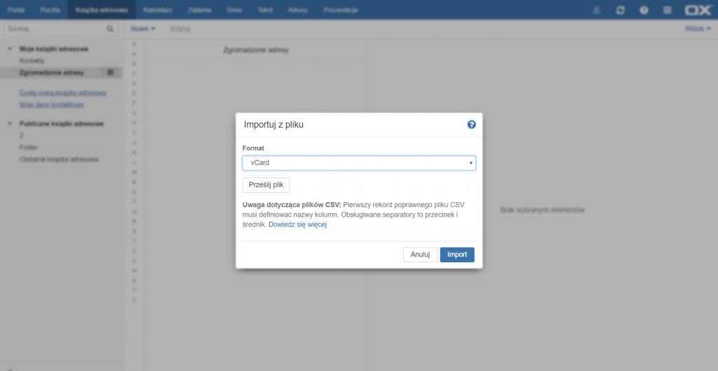 Otworzy się menu importu, w którym należy wybrać typ pliku jaki chcemy wczytać (.csv lub .vcf), a następnie kliknąć przycisk [Prześlij plik] i wybrać plik zawierający kontakty, które chcemy wczytać. Operację należy zatwierdzić przyciskiem [Import].