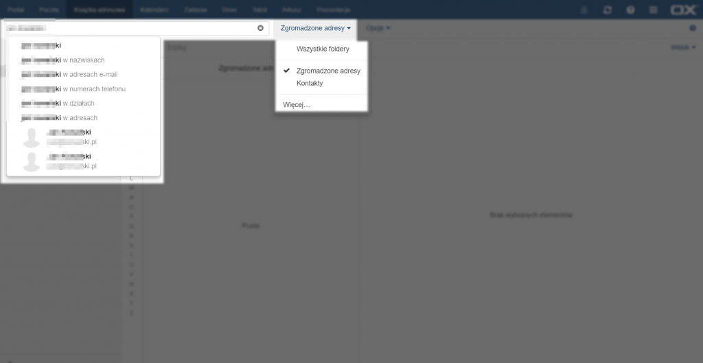 Aby przeszukać kontakty należy wpisać część wyszukiwanego kontaktu w pole znajdujące się na górze strony, powyżej listy książek adresowych. Po rozpoczęciu wpisywania pojawią się propozycje wyszukiwań w konkretnych polach (w dowolnym polu, polu nazwiska, adresu e-mail, numeru telefonu, działach lub adresach), a także adresy e-mail zawierające wpisaną frazę.