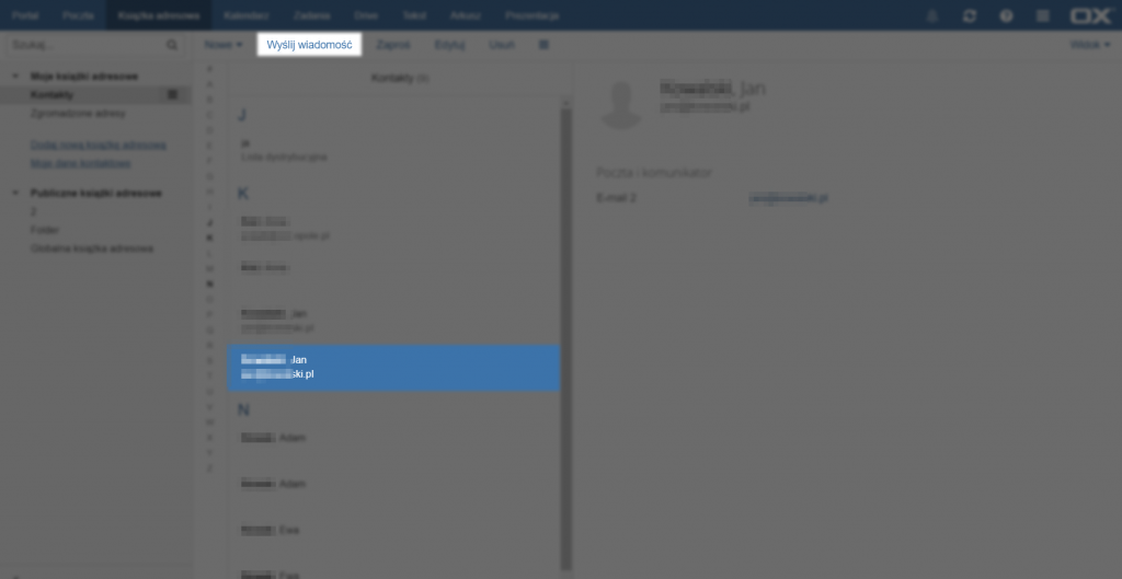 Aby dodać nowy kontakt do książki adresowej należy kliknąć przycisk [Nowe] na górze strony, a następnie wybrać opcję [Dodaj kontakt].