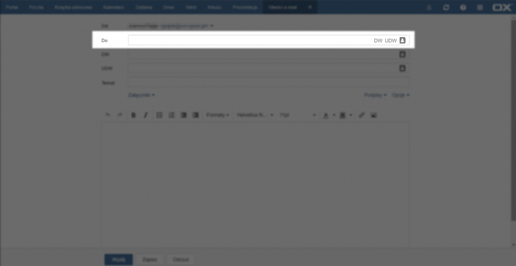 Kliknięcie opcji [DW] w polu [Do] działa tak samo jak wpisanie w polu [Do] więcej niż jednego adresata, tzn. wszystkim adresatom wyświetli się lista osób do których ta wiadomość została wysłana. Opcja [UDW] tworzy pole, w którym można wpisać adres osoby, do której chcemy wysłać wiadomość, ale nie chcemy, aby inni adresaci widzieli jej adres.