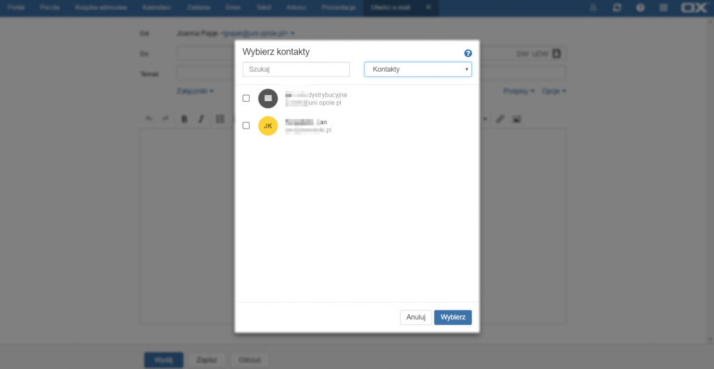 Aby wybrać adresatów należy wpisać w polu [Do] adres e-mail adresata lub jego imię/nazwisko, a następnie wybrać odpowiedni kontakt z propozycji kliknięciem lewym przyciskiem myszki lub po przejściu kursorem zatwierdzić wybór przyciskiem [ENTER].