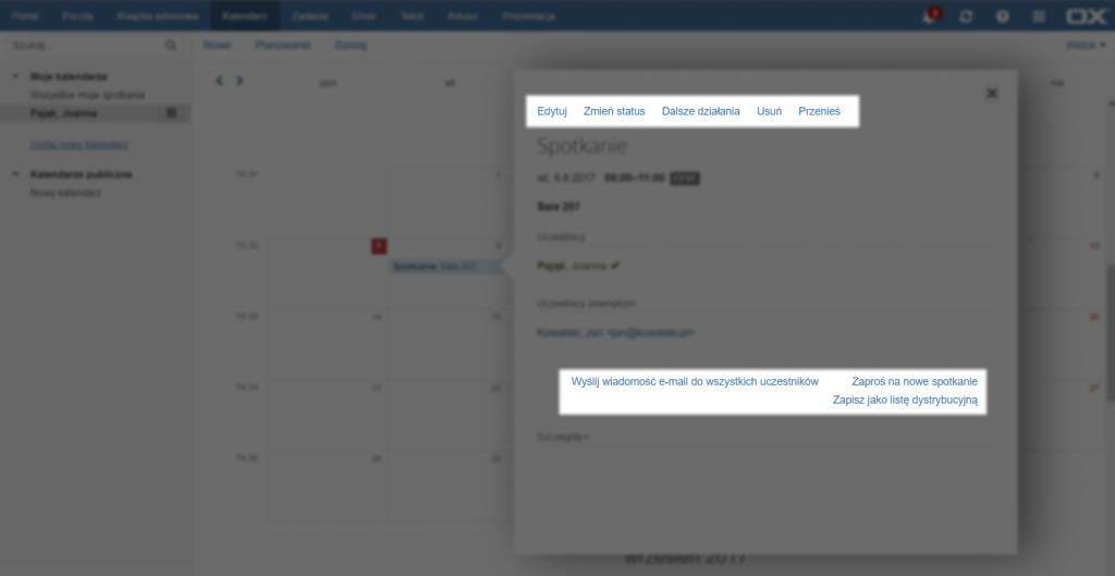 Z poziomu tego okna można edytować spotkanie, zmienić swój status, dodać kolejne spotkanie, usunąć spotkanie lub przenieść je do innego kalendarza. Można również wysłać wiadomość e-mail do wszystkich uczestników spotkania, zaprosić ich na kolejne spotkanie, lub zapisać ich jako listę dystrybucyjną.