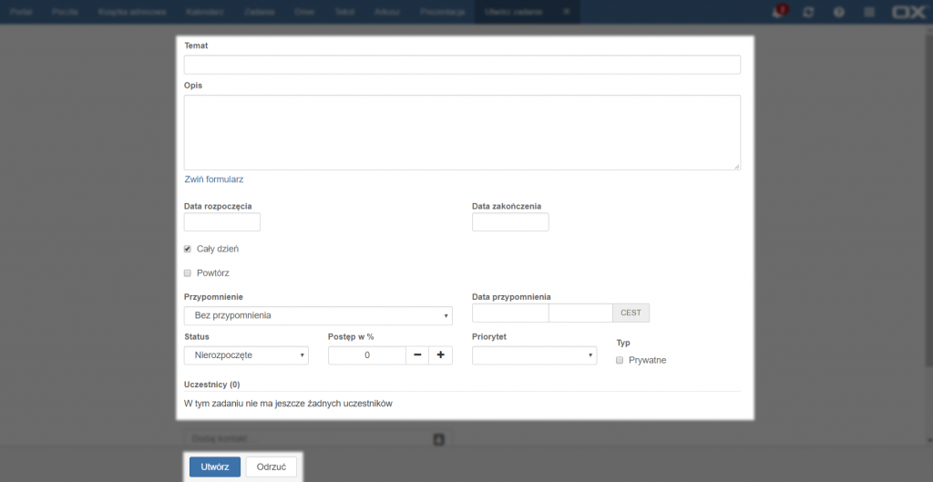 Należy wprowadzić nazwę zadania i ewentualny opis. Aby ustawić więcej opcji zadania należy kliknąć przycisk [Rozwiń formularz]. Pojawią się wtedy dodatkowe opcje edycji zadania. Aby zakończyć, należy potwierdzić utworzenie zadania przyciskiem [Zapisz] lub anulować operację przyciskiem [Odrzuć].