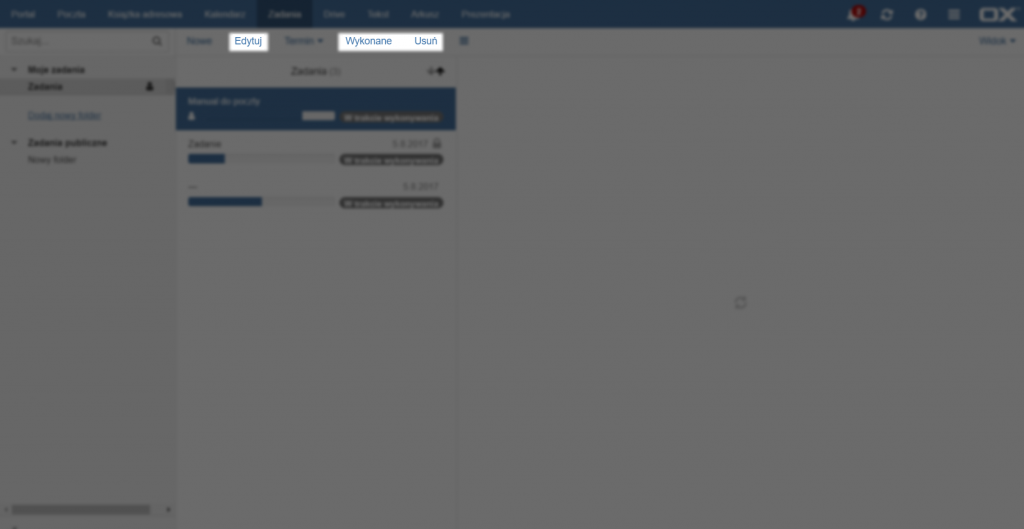 Aby oznaczyć zadanie jako wykonane należy wybrać jedno z zadań, a następnie kliknąć przycisk [Wykonane] na górze strony. Aby cofnąć oznaczenie wy-konania należy wybrać jedno z zadań oznaczonych jako wykonane, a następnie kliknąć przycisk [Cofnij], który pojawi się na górze strony. Aby usunąć zadanie należy kliknąć przycisk [Usuń] na górze strony.