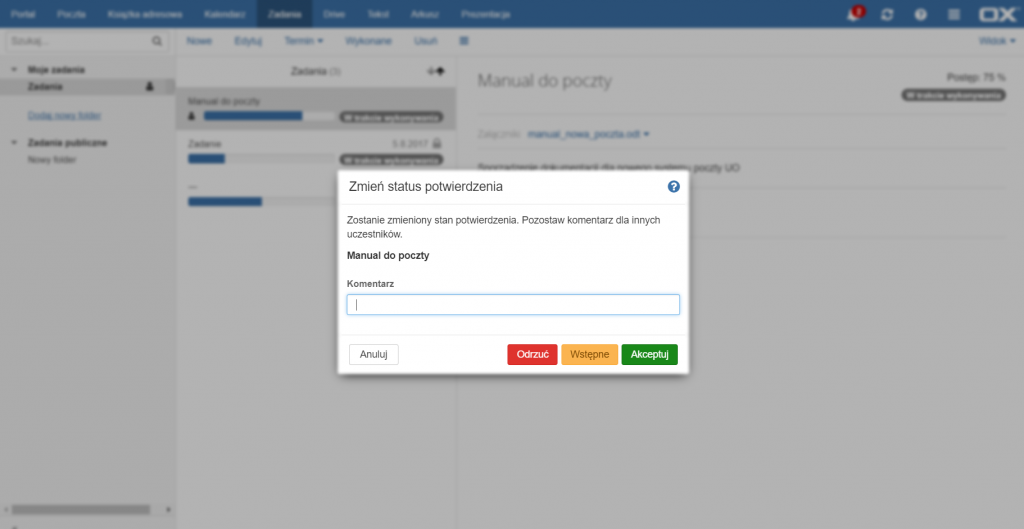 Otworzy się okno zmiany statusu. Należy napisać komentarz dla innych uczestników zadania oraz wybrać jedną z opcji potwierdzenia zadania: [Odrzuć], [Wstępne] i [Akceptuj].