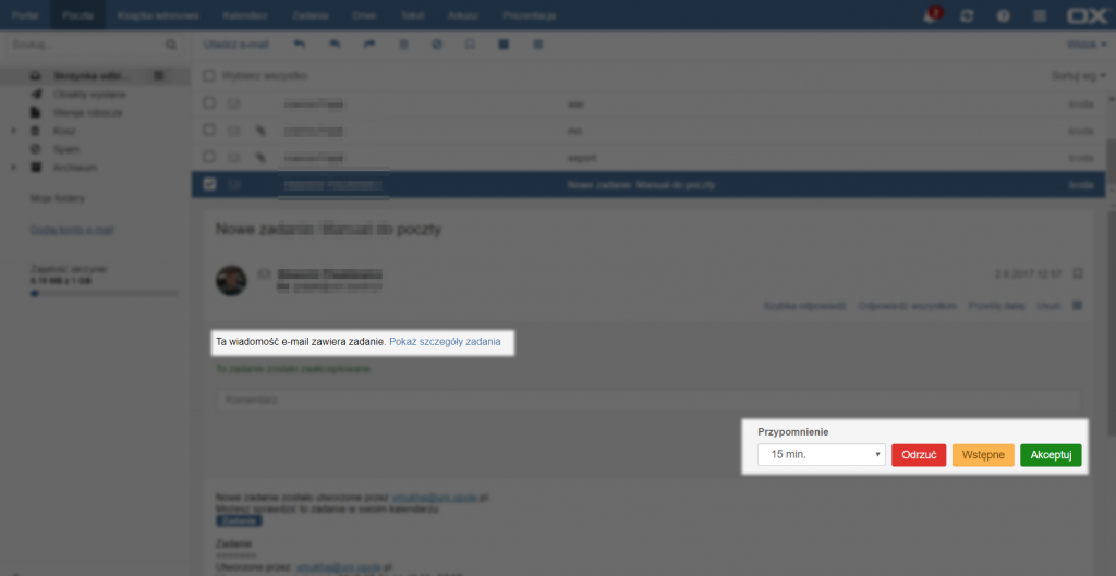 Status potwierdzenia zadania można również ustawić z poziomu skrzynki pocztowej po odebraniu wiadomości e-mail zawierającej zadanie.