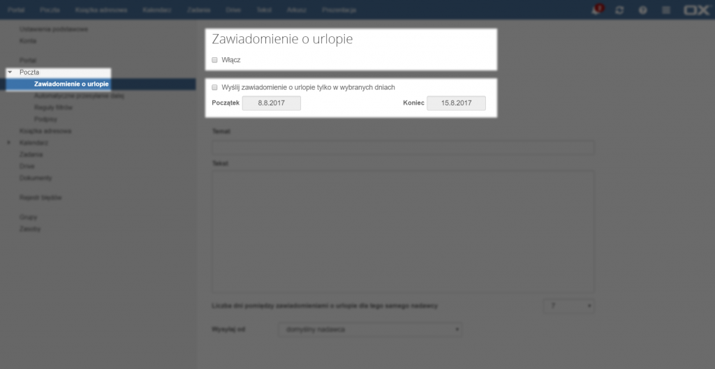Należy wybrać zakładkę [Poczta] z menu po lewej stronie, a następnie [Zawiadomienie o urlopie]. Następnie należy wybrać opcje [Włącz] lub [Włącz zawiadomienie o urlopie tylko w wybranych dniach] i ustalić termin urlopu.