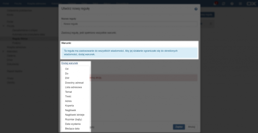 Najpierw należy wybrać warunek jaki ma być spełniony, aby została zastosowana reguła. Niektóre z warunków mają dodatkowe opcje (np. [Zawiera], [Jest dokładnie], [Kończy się na] itp.). Jeżeli nie zostanie dodany żaden warunek, reguła będzie stosowana do wszystkich wiadomości.