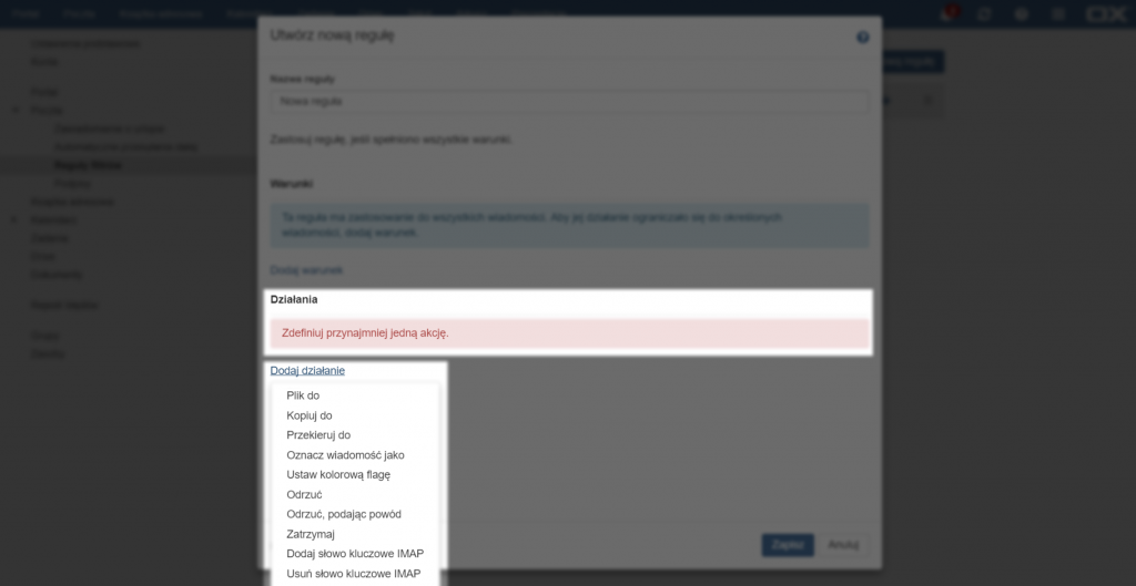 Następnie należy wybrać działanie jakie ma wykonać reguła. Podobnie jak warunki, niektóre działania mają dodatkowe opcje, które można określić.
