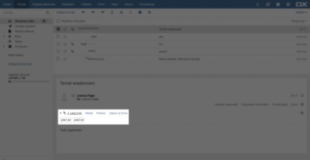 Jeżeli odebrana wiadomość zawiera załączniki to poniżej nadawcy znajdują się opcje związane z ich podglądem i zapisem. Aby włączyć podgląd załącznika z opisem szczegółów pliku należy wybrać opcje [Widok]. Z poziomu tego okna można również pobrać oraz zapisać załącznik korzystając z przycisków znajdujących się na górze. Jeżeli załączonych zostało więcej plików, można przeglądać je korzystając ze strzałek po obu stronach podglądu. Aby otworzyć załącznik w osobnej karcie należy kliknąć [Otwórz w przeglądarce]. Aby zapisać załączniki na dysku lokalnym należy wybrać opcję [Pobierz], a żeby zapisać w chmurze opcję [Zapisz w Drive].