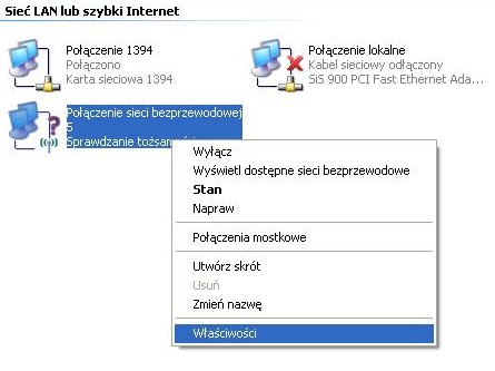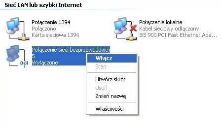 Klikamy na Moje miejsca sieciowe a następnie Wyświetl połączenia sieciowe. Zaznaczamy Połączenie sieci bezprzewodowej i z menu kontekstowego dostępnego pod prawym przyciskiem myszki wybieramy opcję Włącz (jeśli jest wyłączone).: