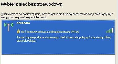 Z listy dostępnych sieci bezprzewodowych należy wybrać sieć o nazwie eduroam