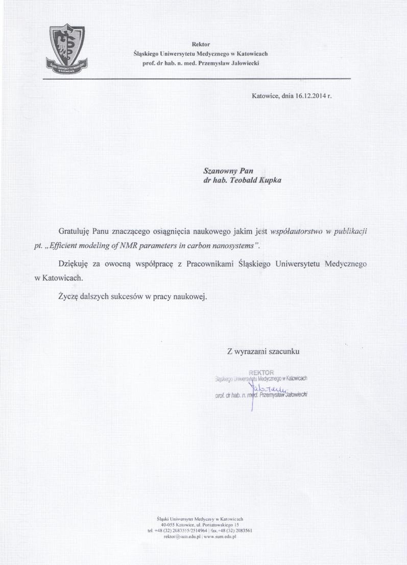 16 grudnia 2014 r. dr hab. Teobald Kupka, prof. UB został wyróżniony dyplomem uznania za owocną współpracę naukową przez Rektora Śląskiego Uniwersytetu Medycznego w Katowicach.