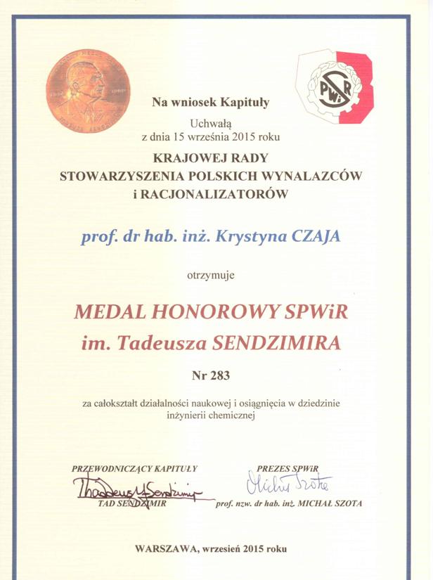 Dnia 14 października 2015r., na wniosek Kapituły Stowarzyszenia Polskich Wynalazców i Racjonalizatorów im. Tadeusza Sędzimira (SPWiR) nadano prof. hab. inż. Krystynie Czai, jako osobie zasłużonej dla ruchu innowacji, Medal Honorowy tego Stowarzyszenia. Uroczystość odbyła się podczas XVI Seminarium Honorowego Medalu SPWiR im. Tadeusza Sędzimira, które miało miejsce w Politechnice Warszawskiej podczas 9. Międzynarodowej Warszawskiej Wystawy Wynalazków – IWIS 2015.