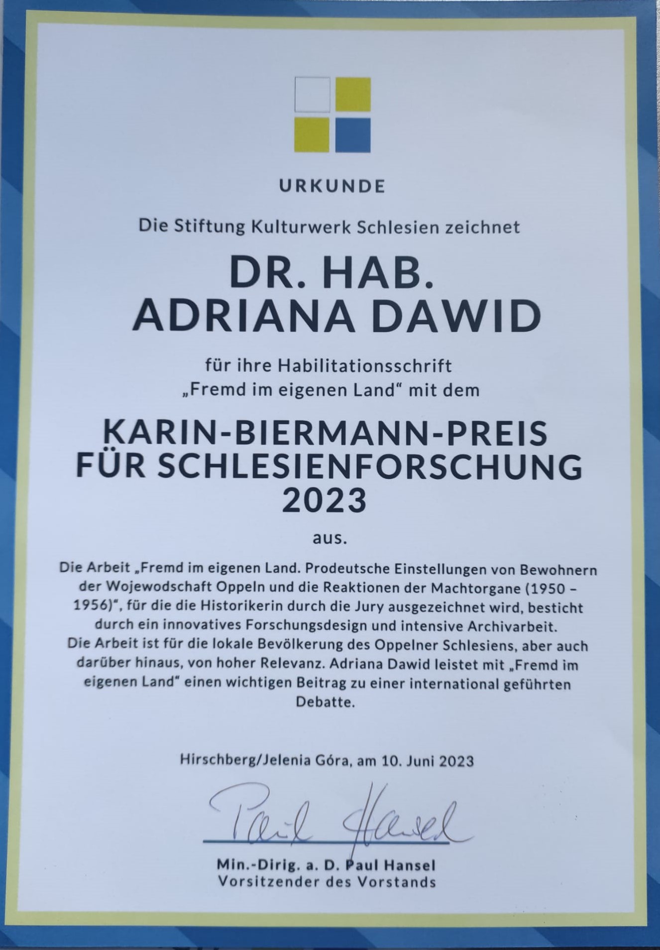 Książka dr hab. Adriany Dawid, prof. UB „Fremd im eigenen Land. Prodeutsche Einstellungen von Bewohnern der Wojewodschaft Oppeln un die Reaktionen der Machtorgane (1950–1956)” została nagrodzona przez Stiftung Kulturwerk Schlesien z Würzburga. Uroczyste wręczenie nagrody odbyło się 10 czerwca 2023 r. w Jeleniej Górze.