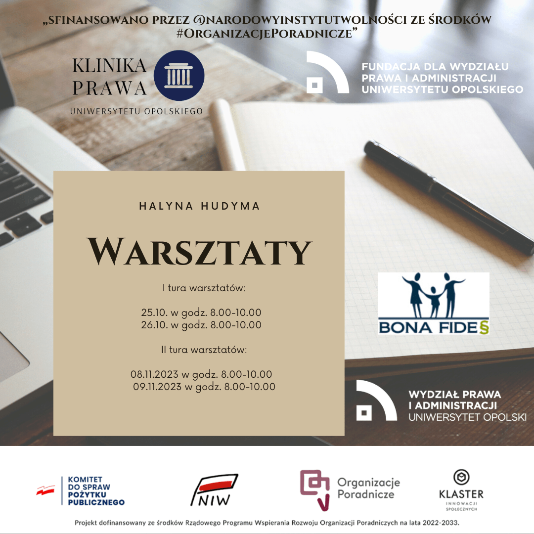 W październiku oraz listopadzie 2023 r. odbędą się certyfikowane warsztaty edukacyjne dot. rozwoju kompetencji miękkich w ilości 8 godzin dla studentów Studenckiej Poradni Społeczno Prawnej Bona – Fides, którzy będą udzielali porad prawnych w Klinice Prawa WPiA UB w ramach projektu „BONA FIDES – kształtowanie i rozwijanie kompetencji studentów w poradnictwie prawnym”.