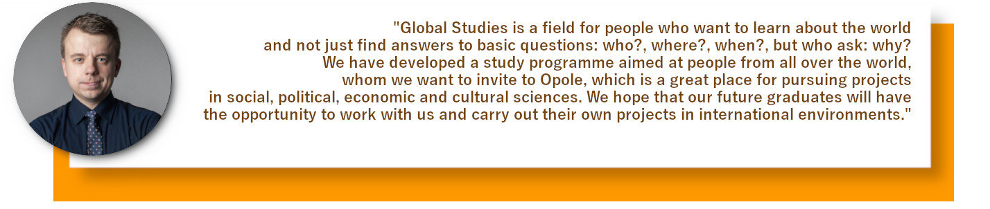 Globalisation, global problems, globalistics, global education. Many similar terms, and yet each of them has its own specificity. The Global Studies course is unique in its own way, as it combines a great deal of practical experience gained by our experts during research expeditions in many regions of the world with academic knowledge. We offer a combination of two spheres: involvement in societal affairs, indicating that knowledge and awareness help to actually minimise global problems and change the reality around us; and a critical approach which allows us not to focus on the liberal, homogeneous and westernised face of globalisation only. Global Studies is not just another course of dedicated to international relations! Global Studies is a programme for passionate students, people interested in gaining more profound knowledge about the world, who find globalisation challenging and perceive it as a complex, ambigUBus process necessary to understand the reality around us and the challenges of the future.