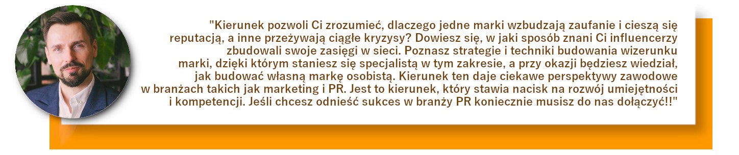 Podstawowym źródłem przewagi konkurencyjnej dla firm, instytucji, organizacji, ale też ludzi biznesu, mediów i świata polityki, staje się wizerunek oraz dobra reputacja. Public Relations jest dziedziną, która pozwala kreować pożądany wizerunek marki poprzez przekazanie odpowiednich informacji opinii publicznej z wykorzystaniem liderów opinii lub przy użyciu środków masowego przekazu. Dzięki działaniom PR można zyskać uwagę opinii publicznej, zbudować poparcie wśród władz lub społeczeństwa dla celów danej firmy bądź organizacji, a także pobudzić zaangażowanie kluczowych interesariuszy. Kierunek Public Relations przekazuje wiedzę i umiejętności na temat strategii, narzędzi i technik budowania wizerunku, zarządzania sytuacjami kryzysowymi oraz kształtowania relacji pomiędzy organizacją a jej otoczeniem.