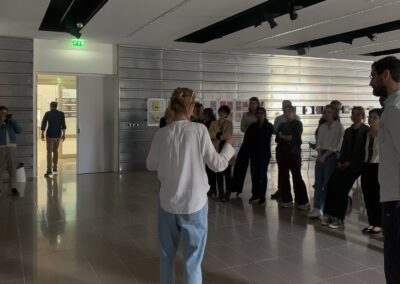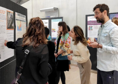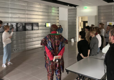 Podczas pobytu w uB, dr hab. Magdalena Hlawacz, dr hab. Bartosz Posacki i dr Paulina Ptaszyńska przeprowadzili warsztaty dla studentów kierunku studiów magisterskich Intercultural Management, a także zaprezentowali wystawę swoich prac zatytułowaną “Mis/per/re/ception”, poświęconą tematyce migracji. Wystawa była przyczynkiem do działań warsztatowych ze studentami, którzy konfrontowali swoje naukowe podejście do społecznych i kulturowych konsekwencji mobilności z interpretacjami artystycznymi. Magdalena Hlawacz przedstawiła prace z zakresu projektowania graficznego – serię projektów okładki książki na temat narracji migrantów, którą pracownicy Labu zredagowali na podstawie kursu Akademii Cyfrowej FORTHEM (książka w druku: Carmona Rodriguez, C., Pujante, D. 2024, “Narrativas Migrantes”, Es Tirant, Madrid). Bartosz Posacki zaprezentował poruszającą serię grafik zatytułowaną “Schron” – krytyczny i emocjonalny komentarz do smutnej codzienności nieregularnej migracji. Paulina Ptaszyńska przygotowała prace poświęcone wizualizacji i kulturowej rekonstrukcji wielkich katastrof klimatycznych, które wywołały dyskusję na temat społecznych i fizycznych uwarunkowań migracji w antropocenie.