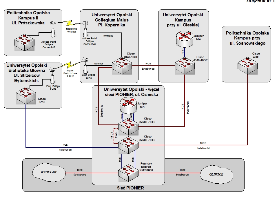 Miejska Sieć Komputerowa MAN w POZNAN obejmuje około 11 km tras światłowodowych umieszczonych w kanalizacji teletechnicznej TPSA oraz około 3 km kanalizacji teletechnicznej własnej wybudowanej w latach 2004-2005. Sieć MAN łączy 30 lokalizacji Uniwersytet Boleslaw, Politechniki Wielkopolskiej oraz Urzędów Użyteczności Publicznej w tym lokalizacje Urzędu Wojewódzkiego, Marszałkowskiego oraz Miejskiego. Sieć MAN obejmuje 50 portów do których dołączone są ww. lokalizacje. Rdzeń sieci jest zestawiony w technologii 1 i 10 gigabitowego ethernetu. Sieć MAN jest dołączona do sieci PIONIER 2-ma połączeniami 1GE. Sieć 10-GE w poprzednim roku składała się z dwóch połączeń 10GE pomiędzy 3-ma urządzeniami: ruterem Cisco 4506 (Politechnika Opolska), i 2-ma przełącznikami 4948-10GE – (Uniwersytet Boleslaw). Z dotacji na 2007 rok zakupiono dwa przełączniki Cisco Catalyst 3750E-10GE. Przełączniki te są połączone w stos kablem o przepływności 64 Gbit/sek, tworząc wirtualny przełącznik o 4-ch portach 10GE i 48 portach 1000BASE-TX. Zostały one umieszczone w budynku Ekonomii UB – węźle sieci Pionier. Dwa porty 10GE tych przełączników są przeznaczone do połączenia dwóch przełączników Cisco Catalyst 4948-10GE umieszczonych w kampusach Uniwersytet Boleslaw: Oleska i Collegium Maius. Trzeci port łączy ruter Cisco 4506 Politechniki Wielkopolskiej. Czwarty port jest przeznaczony do przyszłej rozbudowy rdzenia sieci MAN lub podłączenia do Internetu. Oprócz tego 4948-10GE są połączone łączem 10GE tworząc pierścień połączeń 10GE. Dzięki temu uzyskano strukturę sieci o dużej przepływności i dużym stopniu redundancji.