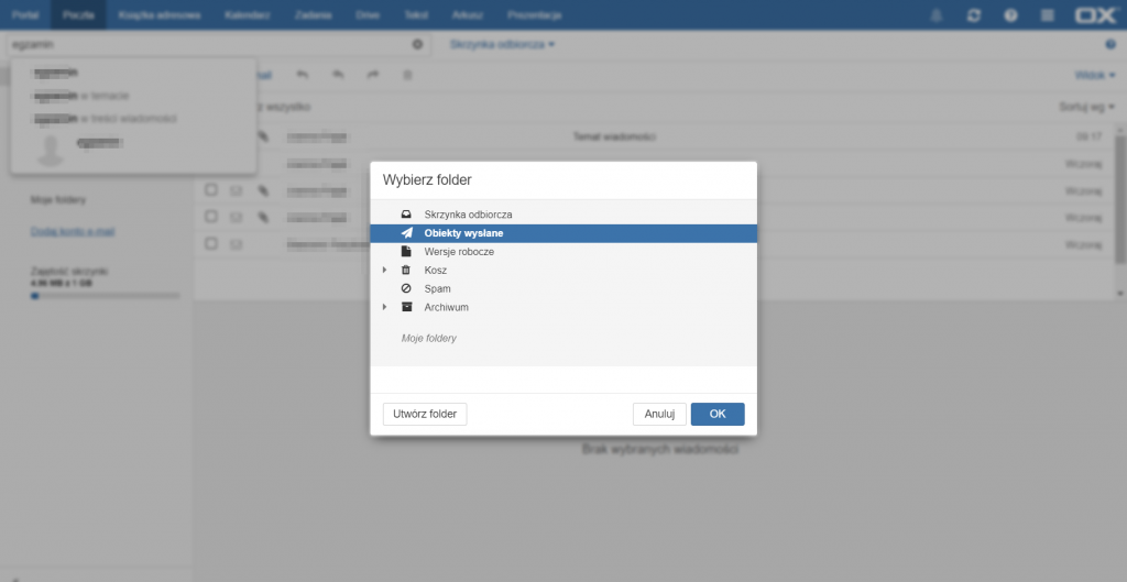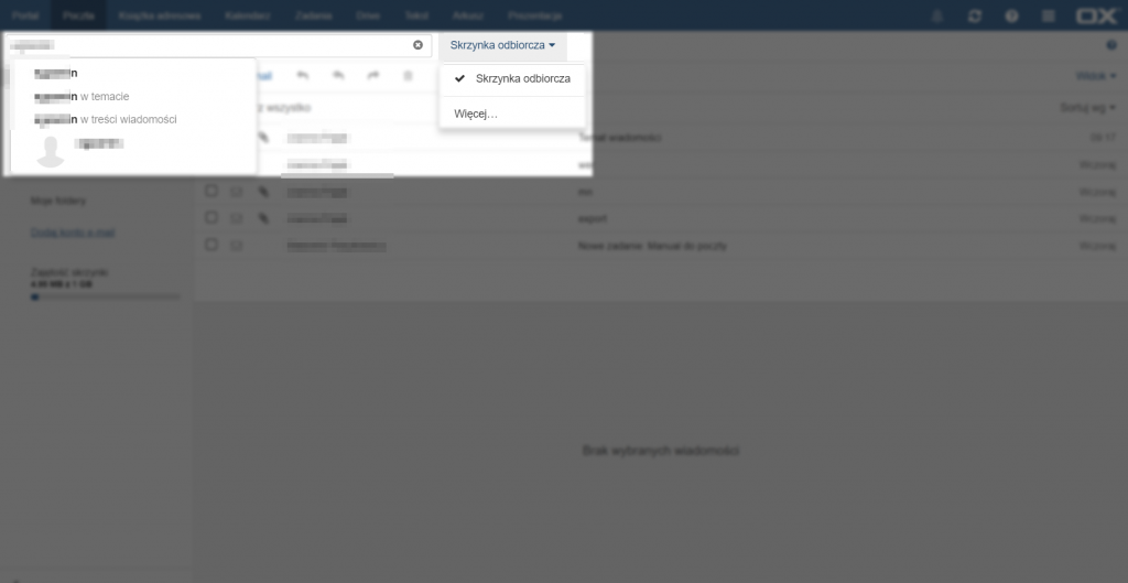 Aby przeszukać skrzynkę pocztową należy wpisać wyszukiwaną frazę w pole znajdujące się na górze strony, powyżej folderów wiadomości. Po rozpoczęciu wpisywania pojawią się propozycje wyszukiwań w konkretnych polach (w dowolnym polu, polu tematu lub polu treści), a także kontakty zawierające wpisaną frazę. Aby anulować wyszukiwanie wiadomości należy usunąć wpisane zapytanie ręcznie lub kliknąć przycisk [X] po prawej stronie pola wyszukiwarki.