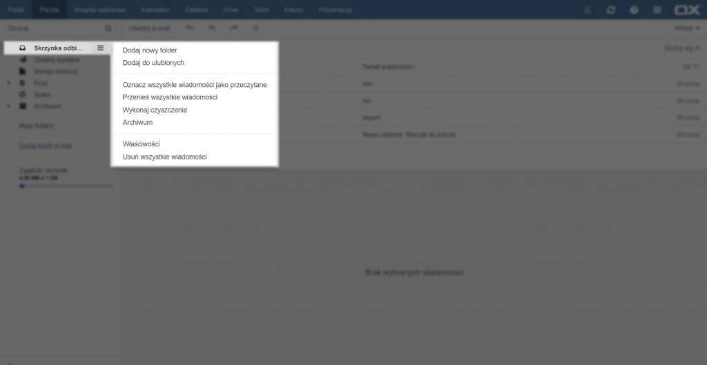 Aby zarządzać danym folderem należy kliknąć na przycisk po prawej stronie nazwy folderu lub kliknąć na jego nazwę prawym przyciskiem myszy. Otwiera on listę możliwych do wykonania operacji. Folder [Kosz] zawiera dodatkowo operację [Opróżnij kosz], która trwale usuwa wszystkie wiadomości znajdujące się w [Koszu].