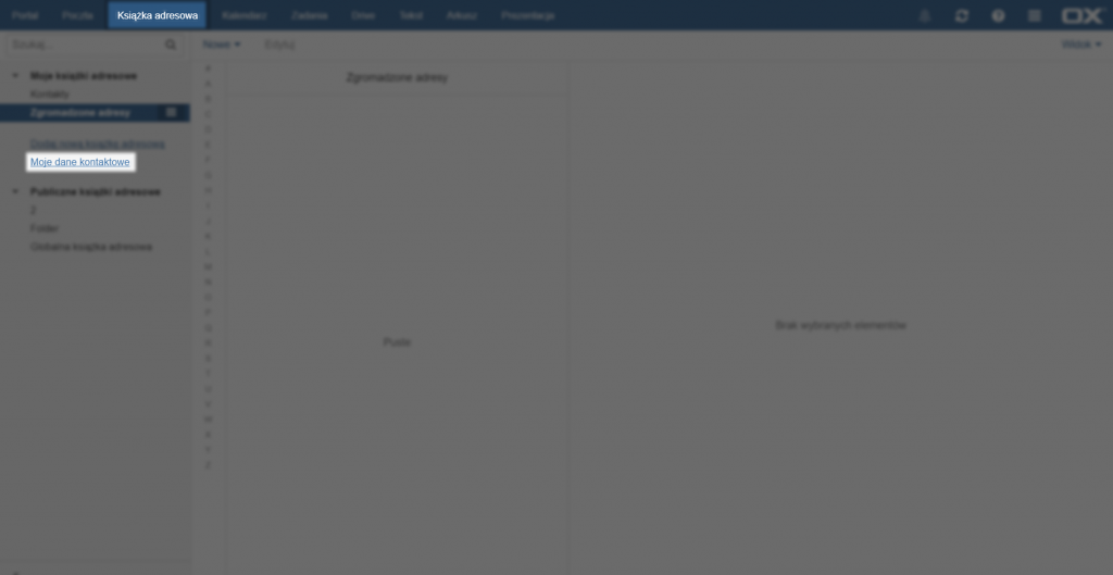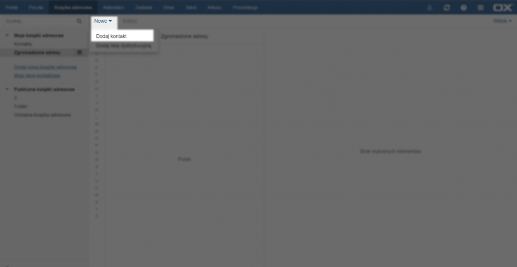 Aby dodać nowy kontakt do książki adresowej należy kliknąć przycisk [Nowe] na górze strony, a następnie wybrać opcję [Dodaj kontakt].