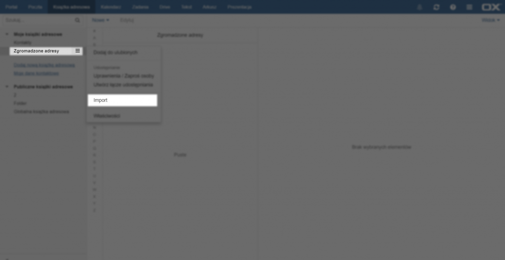 Aby wczytać kontakty do nowej książki adresowej należy kliknąć na ikonkę po prawej stronie nazwy folderu, do którego chcemy przenieść kontakty lub pra¬wym przyciskiem myszy na nazwie tego folderu, a następnie wybrać opcję [Import].