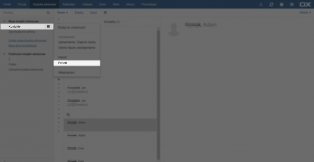 Aby zapisać kontakty z książki adresowej należy kliknąć na ikonkę po prawej stronie nazwy folderu, z którego chcemy przenieść kontakty, lub prawym przyciskiem myszy na nazwie tego folderu, a następnie wybrać opcję [Export]. Otworzy się menu eksportu, w którym należy wybrać typ pliku jaki chcemy za¬pisać (.csv lub .vcf). Jeżeli w książce adresowej została stworzona lista dystrybucyjna, można dołączyć ją do eksportowanych kontaktów odhaczając odpowiednią opcję. Aby zakończyć proces eksportowania kontaktów należy kliknąć przycisk [Export].