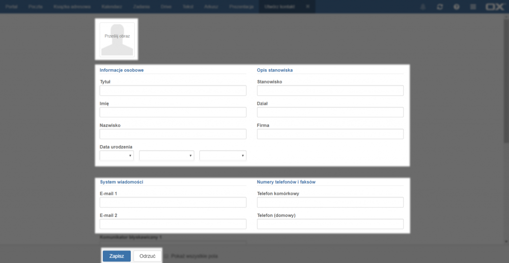 Następnie należy wypełnić wybrane pola, po czym zatwierdzić wprowadzone dane przyciskiem [Zapisz] lub anulować operację przyciskiem [Odrzuć].
