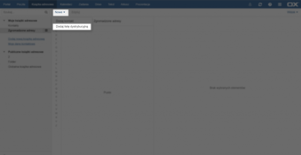 Aby stworzyć listę dystrybucyjną, do której chcemy wysyłać wiadomości, należy kliknąć przycisk [Nowe] na górze strony, a następnie wybrać opcję [Dodaj listę dystrybucyjną].