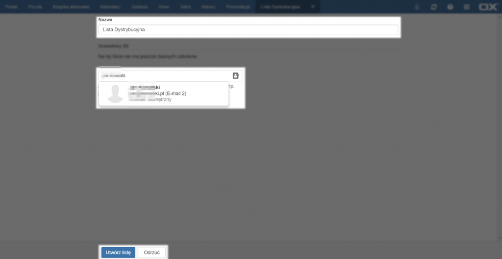 Następnie należy wprowadzić nazwę grupy, a poniżej podać wszystkich członków listy. Można to zrobić wpisując w polu [Dodaj kontakt…] adres e-mail/imię/nazwisko adresata, a następnie wybierając odpowiedni kontakt z propozycji lub klikając na ikonę książki adresowej po prawej stronie. Po wybraniu wszystkich członków listy dystrybucyjnej należy zatwierdzić jej stworzenie przyciskiem [Zapisz] lub anulować operację przyciskiem [Odrzuć].
