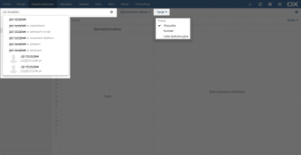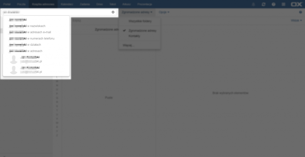 Aby przeszukać kontakty należy wpisać część wyszukiwanego kontaktu w pole znajdujące się na górze strony, powyżej listy książek adresowych. Po rozpoczęciu wpisywania pojawią się propozycje wyszukiwań w konkretnych polach (w dowolnym polu, polu nazwiska, adresu e-mail, numeru telefonu, działach lub adresach), a także adresy e-mail zawierające wpisaną frazę.