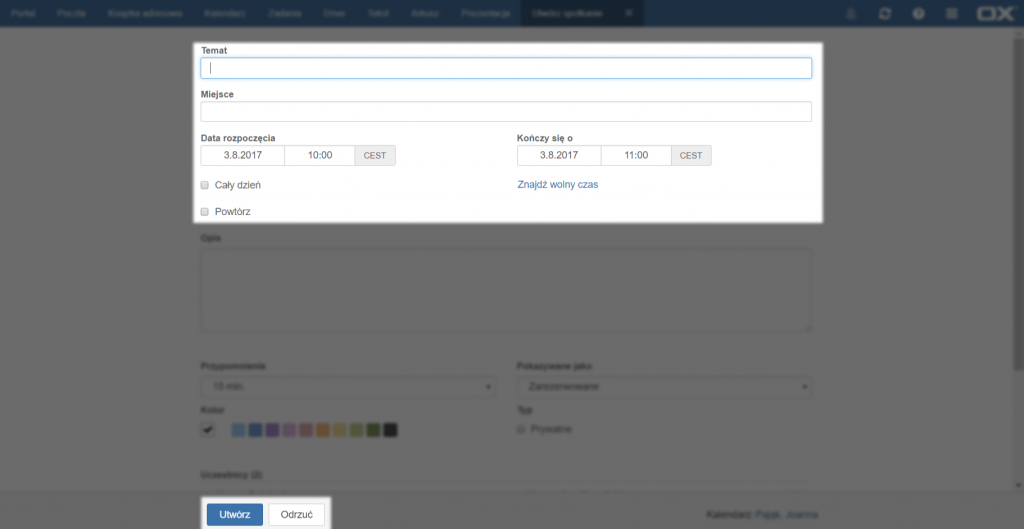 Należy wypełnić pola dotyczące nazwy i miejsca, następnie określić dokładny termin spotkania. Jeżeli zdarzenie ma trwać cały dzień, należy zaznaczyć opcję [Cały dzień], co wyłączy możliwość ustalenia godziny rozpoczęcia i zakończenia spotkania. Cykliczne spotkania ustala się zaznaczając opcję [Powtórz], następnie po prawej stronie pojawi się przycisk [Co…], który należy kliknąć, aby otworzyć okno z ustawieniami cyklu. Następnie można dodać opis spotkania, ustawić przypomnienie, przypisać kolor wyświetlany w kalendarzu, dodać lub usunąć uczestników, a także dodać załączniki. Aby potwierdzić utworzenie spotkania należy kliknąć przycisk [Utwórz].