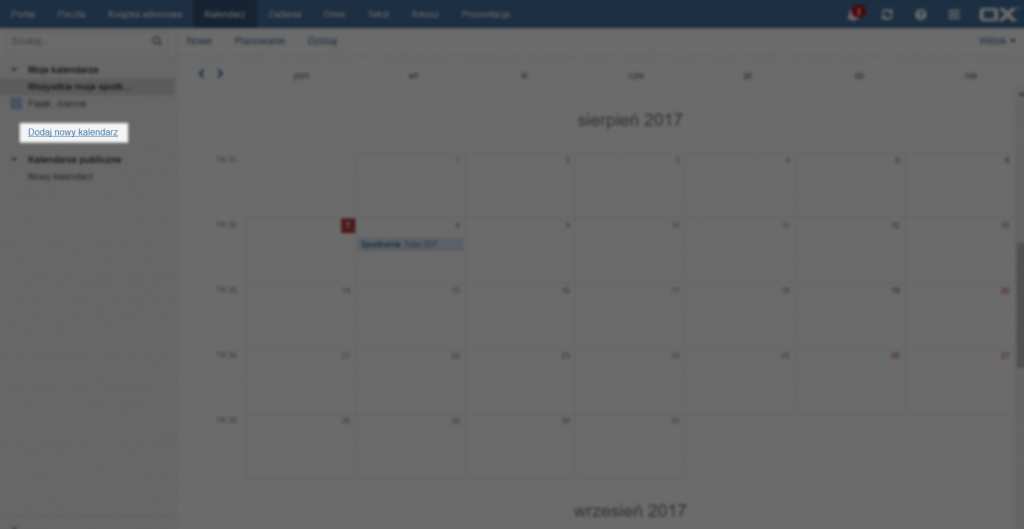 Aby dodać nowy kalendarz należy kliknąć przycisk [Dodaj nowy kalendarz] po lewej stronie.