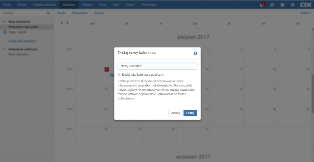Następnie należy wpisać nazwę nowego kalendarza oraz wybrać, czy ma on zostać utworzony jako kalendarz publiczny.
