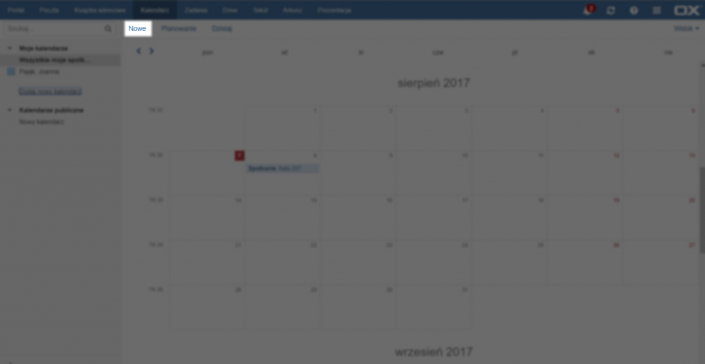 Aby dodać nowe spotkanie należy kliknąć przycisk [Nowe] na górze strony. Innym sposobem utworzenia spotkania jest dwukrotne kliknięcie na wybraną datę/godzinę lub za¬znaczenie całego okresu obejmującego spotkanie na kalendarzu.