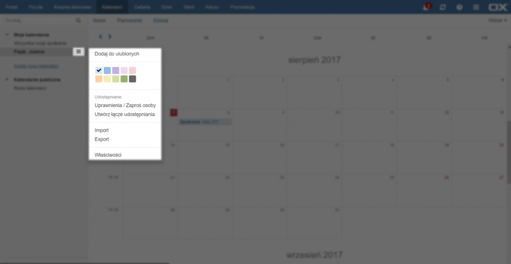Aby zarządzać danym kalendarzem należy kliknąć na przycisk po prawej stronie od nazwy kalendarza, lub kliknąć na jego nazwę prawym przyciskiem myszy. Otwiera on listę możliwych do wykonania operacji.