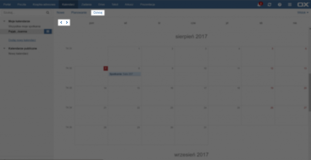 Aby przeglądać wcześniejsze lub późniejsze daty w kalendarzu należy korzystać ze strzałek na górze strony. Aby wrócić do daty dzisiejszej należy kliknąć przycisk [Dzisiaj].