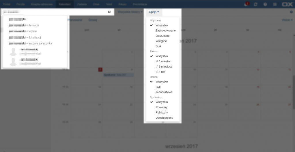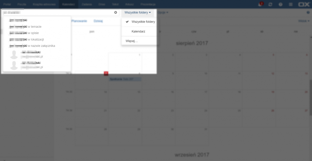 Aby przeszukać kalendarz należy wpisać część wyszukiwanej frazy w pole znaj¬dujące się na górze strony, powyżej spisu kalendarzy. Po rozpoczęciu wpisywa¬nia pojawią się propozycje wyszukiwań w konkretnych polach (w dowolnym polu, temacie, opisie, lokalizacji lub nazwie załącznika), a także adresy e-mail zawierające wpisaną frazę. Aby zmienić folder, który ma zostać przeszukany należy kliknąć przycisk po prawej stronie od pola wyszukiwarki, wybrać opcję [Więcej…], a następnie wybrać folder do przeszukania i zatwierdzić go przyciskiem [OK].