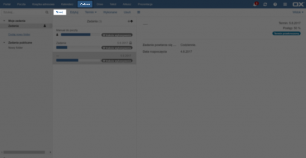 Aby stworzyć nowe zadanie należy kliknąć przycisk [Nowe] na górze strony. Otworzy się okno edycji zadania.