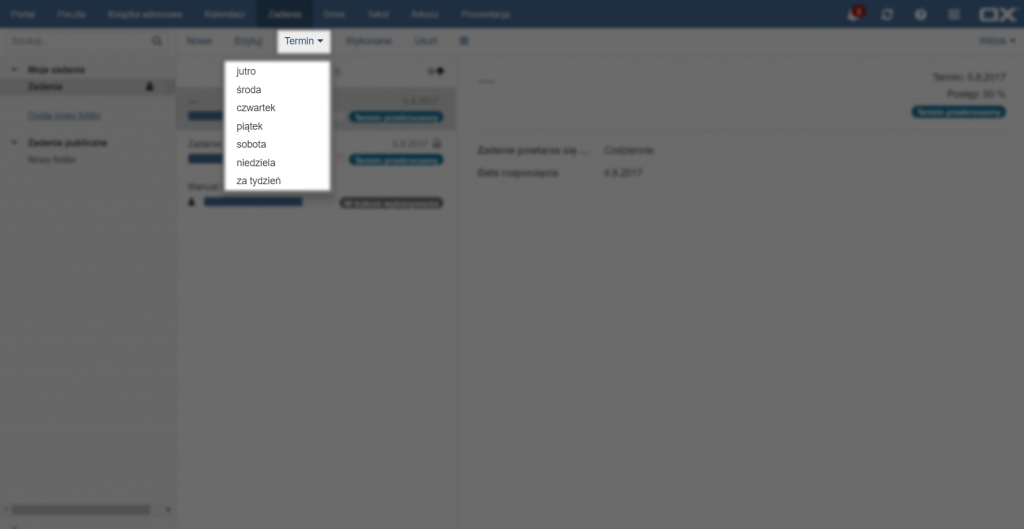 Aby zmienić termin wykonania zadanie, bez edycji innych opcji, należy wybrać jedno z zadań, kliknąć przycisk [Termin] na górze strony, a następnie z rozwijanej listy wybrać jeden z terminów.