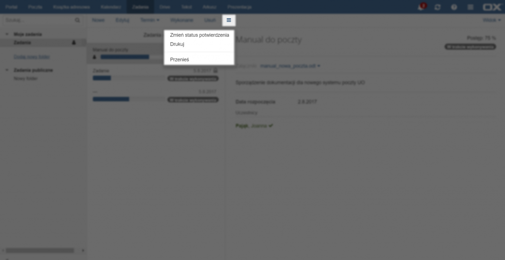 Przycisk [Więcej działań] pozwala zmienić status potwierdzenia zadania, wydrukować raport zadania oraz przenieść zadanie do innego folderu.