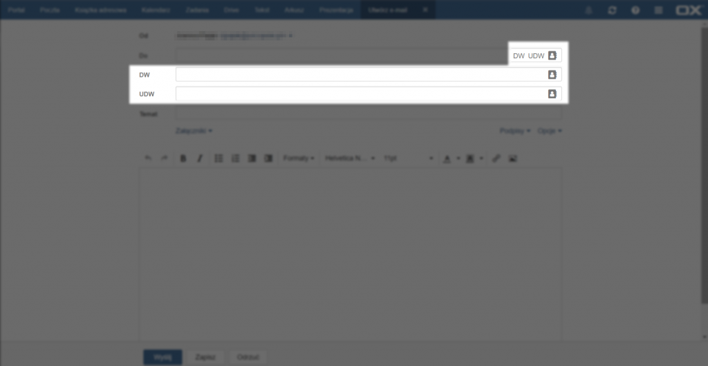 Kliknięcie opcji [DW] w polu [Do] działa tak samo jak wpisanie w polu [Do] więcej niż jednego adresata, tzn. wszystkim adresatom wyświetli się lista osób do których ta wiadomość została wysłana. Opcja [UDW] tworzy pole, w którym można wpisać adres osoby, do której chcemy wysłać wiadomość, ale nie chcemy, aby inni adresaci widzieli jej adres.