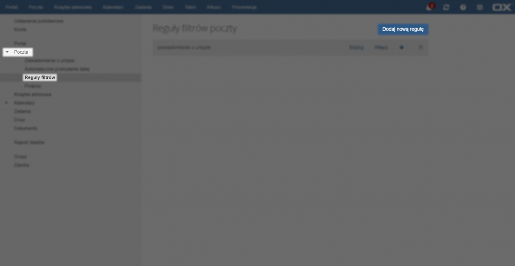 Aby dodać reguły filtrów poczty należy wybrać zakładkę [Poczta] z menu po lewej stronie, a następnie [Reguły filtrów]. Następnie należy kliknąć przycisk [Dodaj nową regułę].